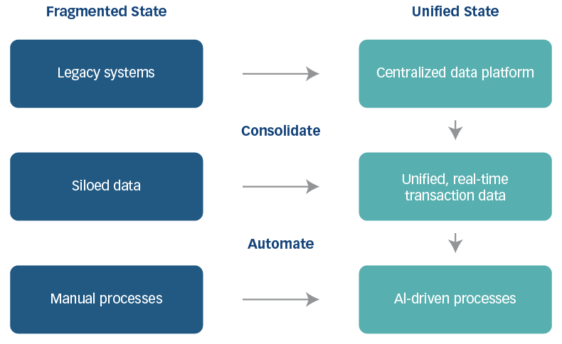 Fragmented payment and transaction data, trapped in legacy systems and siloed infrastructure, complicates AI implementation. This scattered data blocks the path to robust AI models, risking incomplete or shaky insights that could stall strategic goals.
